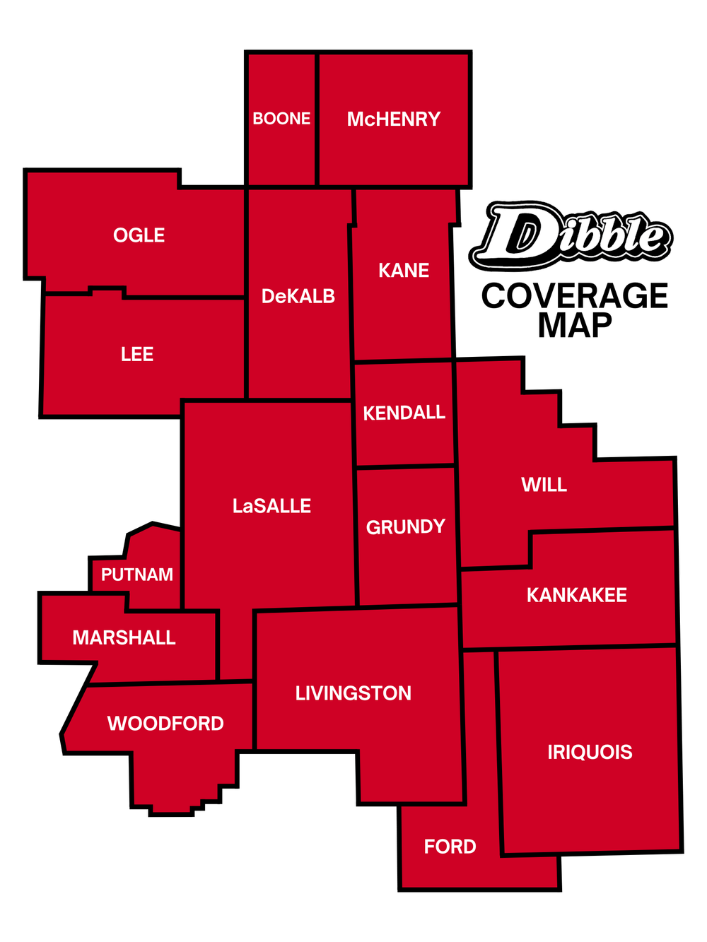 BOONE, DEKALB, FORD, GRUNDY, IROQUOIS, KANE, KANKAKEE, KENDALL, LASALLE, LIVINGSTON, LEE, MARHSALL, MCHENRY, OGLE, PUTNAM, WILL, and WOODFORD counties. For service outside this area, please contact us at 815-237-2247.